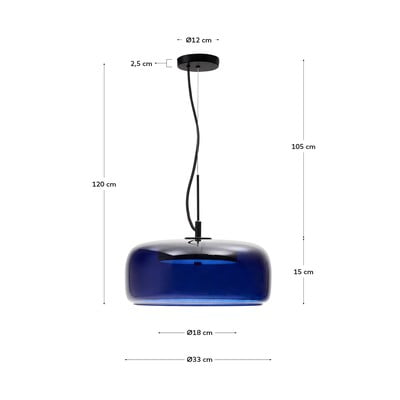 Kave Home tumši zilais piekaramais gaismeklis Reig ar 38 cm diametra stikla abažūru ir aprīkots ar integrētu 10 W LED gaismu.