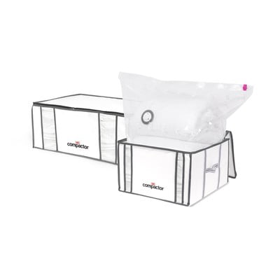 Pārpalikušo gaisu var ērti izsūkt ar putekļsūcēju. Pateicoties vienvirziena vārstam, jums nav jāuztraucas par to, ka maiss pēc gaisa izsūkšanas atkal piepūtīsies. Tam ir arī caurspīdīgi lodziņi, lai viegli identificētu saturu, un integrētas savelkamās siksniņas, kas ļauj maisu uzglabāt pat vertikālā stāvoklī.