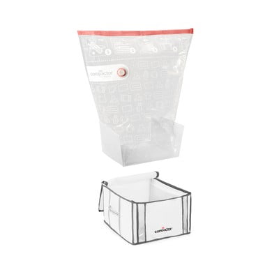 Pārpalikušo gaisu ērti var izsūkt ar mājas putekļsūcēju. Pateicoties vienvirziena vārstam, jums nav jāuztraucas par to, ka pēc gaisa izsūkšanas maiss atkal piepūtīsies. Tam ir arī caurspīdīgi lodziņi, lai viegli identificētu saturu, un integrētas savelkamās siksniņas, kas ļauj maisu uzglabāt pat vertikālā stāvoklī.