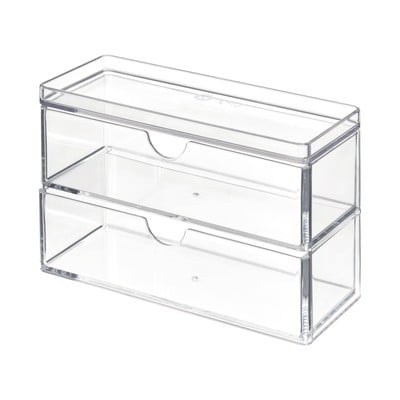 iDesign/The Home Edit vates tamponu organizators ir izgatavots no īpaši izturīgas plastmasas. Tā izmēra dēļ tas labi iekļaujas vannas istabas skapīšos un šauros plauktos.