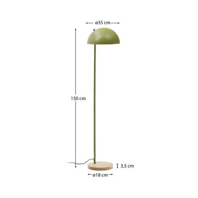 Catlar stāvlampa no Kave Home ir izgatavota no metāla ar zaļu apdari. Lampai ir pusapaļš abažūrs, un tā stāv uz vienkāršas oškoka pamatnes. Tā ir saderīga ar E27 spuldzi ar maksimālo jaudu 40 W. Spuldze nav iekļauta komplektā.