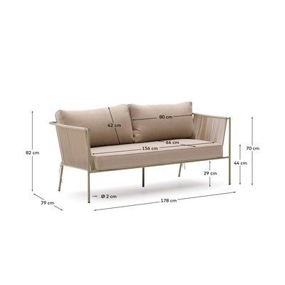 Zīmola Kave Home dārza dīvāns Zivia ir divvietīgs dārza dīvāns, kas ir ideāli piemērots āra sēdvietām. Tā sēdeklis ir ar rokām adīts no UV izturīgas sintētiskas virves. Dīvāna konstrukcija ir izgatavota no cinkota tērauda, kas ir izturīgs pret rūsu un koroziju, nodrošinot daudz ilgāku kalpošanas laiku nekā parastais tērauds. Dīvāns ir paredzēts 100% lietošanai ārpus telpām. Komplektā ietilpst arī spilveni ar noņemamiem pārvalkiem, kas izgatavoti no ūdensnecaurlaidīga auduma. Lai saglabātu to kvalitāti, mēs iesakām uzglabāt spilvenus lietainā laikā.