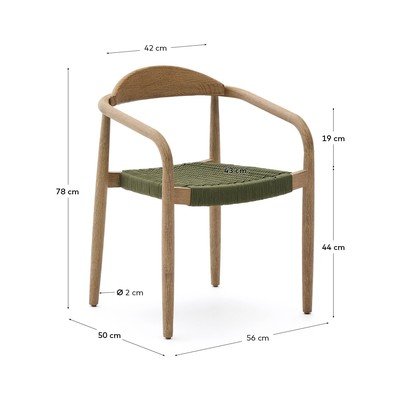 Zīmola Kave Home ēdamistabas krēsls Nina ir izgatavots no dabīgiem materiāliem, izmantojot amatnieciskus procesus. Tā konstrukcija ar atzveltnēm ir izgatavota no akācijas masīvkoka ar dabisku apdari, un katrs gabals ir ar unikālu toni un koka tekstūru. Koksnei ir FSC™ sertifikāts, kas nodrošina atbildīgu mežu apsaimniekošanu. Krēsla sēdeklis ir izgatavots no ar rokām austas auklas, kas ir izturīga pret UV starojumu. Vienādus krēslus var salikt vienu uz otra. Tas ir piemērots lietošanai iekštelpās un ārpus telpām.