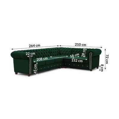 Samta, salokāms, Chesterfield, ar labo stūri/L veida, zaļš, ūdensizturīgs/pret traipiem noturīgs, četrvietīgs, platums 264 cm