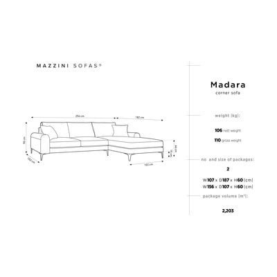 Samta U veida dīvāns no "Mazzini Sofas Madara" kolekcijas ieviesīs jūsu viesistabā ne tikai modernas vēsmas, bet arī komfortu, jo tas ir pietiekoši plašs, lai atpūstos kopā ar ģimeni. Komplektā iekļauti arī divi dekoratīvie spilveni. Dīvāna greznais samta polsterējums ar smalko spīdumu ir lielisks papildinājums elegantam interjeram. Vienlaikus tā materiāls ir pieskārienam mīksts un zīdains. Dīvānam ir arī ļoti laba nodilumizturība, kas ievērojami samazina tā bojājumu risku.