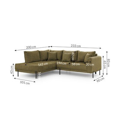No šenila auduma, ar kreiso stūri/L veida, zaļš, mājdzīvniekiem piemērots/pret traipiem noturīgs, četrvietīgs, platums 233 cm