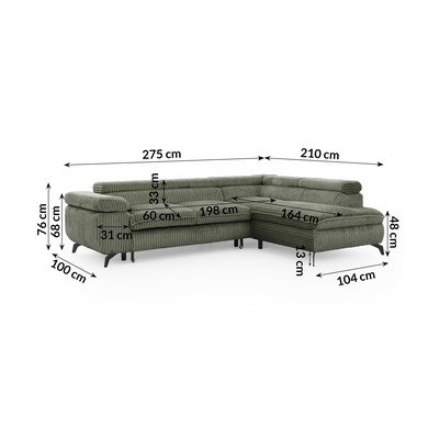Stūra dīvāns MarbeyaVelveta, regulējams/salokāms/ar uzglabāšanas vietu, ar labo stūri/L veida, zaļš, mājdzīvniekiem piemērots/pret traipiem noturīgs, četrvietīgs, platums 275 cm