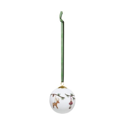 Porcelāna bumbu rotā šai kolekcijai raksturīgs motīvs – priežu zars ar čiekuriem, uz kuriem piekārti Ziemassvētku rotājumi. Pateicoties zaļajai zīda lentītei, to var viegli iekārt uz eglītes vai zara vāzē.