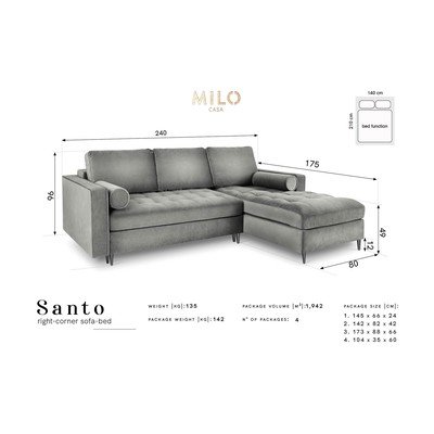 "Milo Casa Santo" izvelkamais dīvāns ar diviem dekoratīviem spilveniem piešķir interjeram greznu akcentu un ir pietiekoši liels, lai nodrošinātu lielisku atpūtas vietu visai ģimenei. "Milo Casa" zīmola izmantotie audumi ir rūpīgi testēti, lai nodrošinātu izturību, komfortu un pievilcību. Dīvāna pārklājumam ir izmantots pieskārienam tīkams, nodilumizturīgs audums ar vieglu spīdumu.