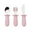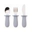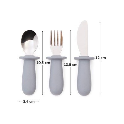 Komplektā ietilpst karote, dakša un nazis. Visām trim daļām ir izturīgi, ergonomiski silikona rokturi, kas ir ideāli piemēroti mazām bērnu rociņām. Metāla funkcionālās daļas ir izturīgas, un naža asmens ir strups un drošs bērniem.