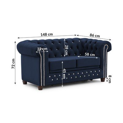 Samta, salokāms, Chesterfield, zils, ūdensizturīgs/pret traipiem noturīgs, divvietīgs, platums 148 cm